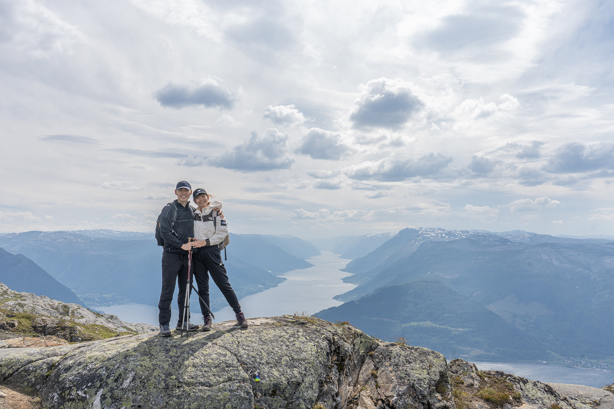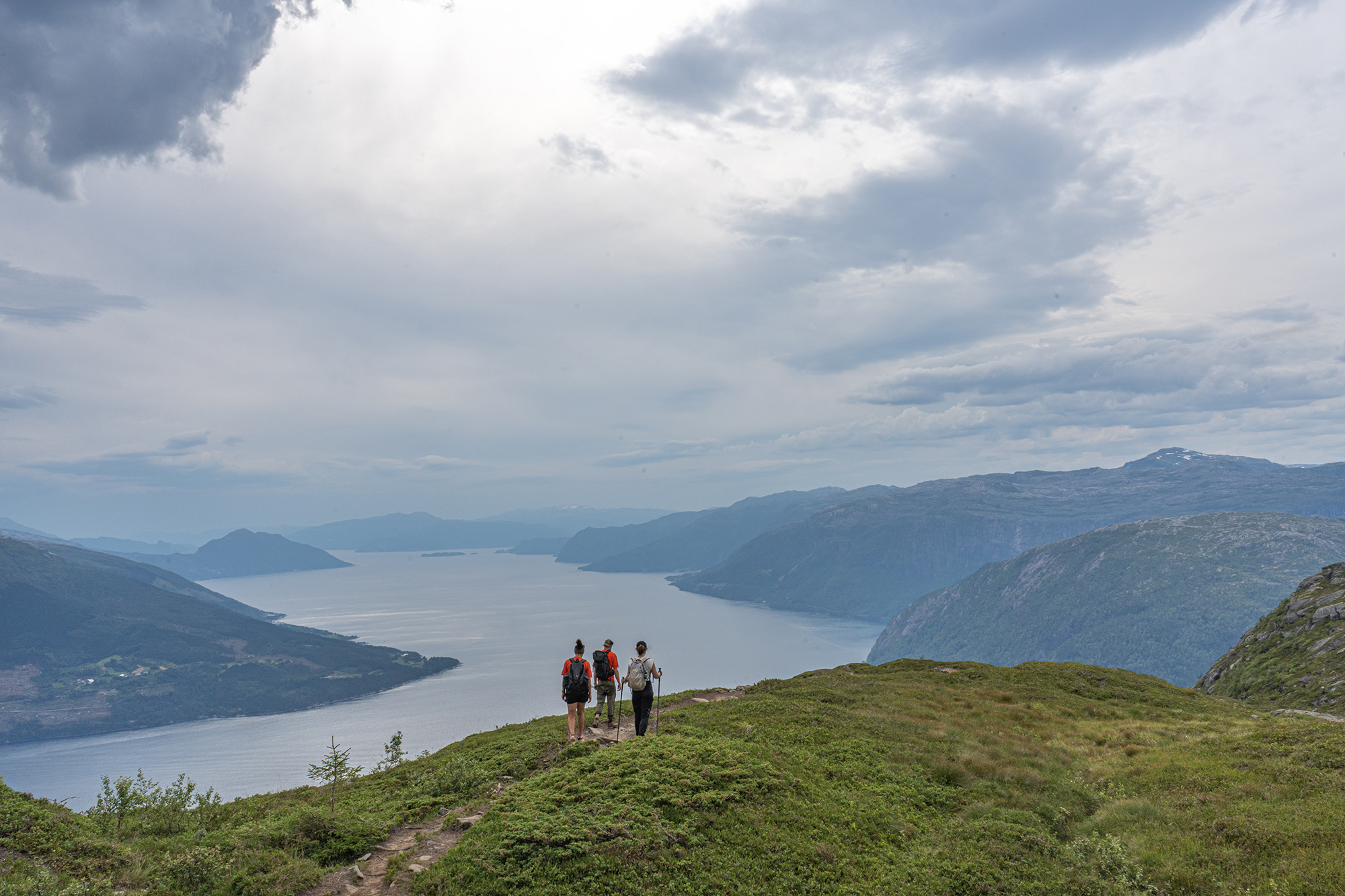 The hike is demanding, ca 1000 meters of ascent to be climbed. But it is wurth all the struggle, reaching the top and see the Hardanger mountains plunging into deep fjord arms in such a spectacular way.