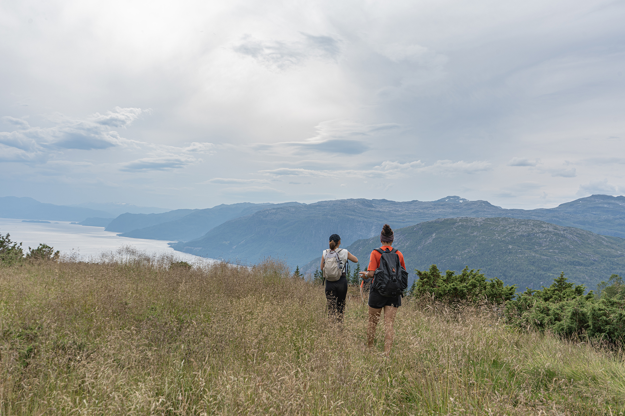 At the top you get a fantastic 360-degree view of a spectaculr fjordlandscape, and can see the famous Hardanger "cross" of the fjords below you. Eidfjorden to the north, Kinsarvik to the east, Sørfjorden to the south, and the Hardangerfjorden to the west. Added to this can see large parts of Hardangervidda National park, Folgefonna Glacier National park and Vossefjella and Raundalsryggen peaks in the northwest.