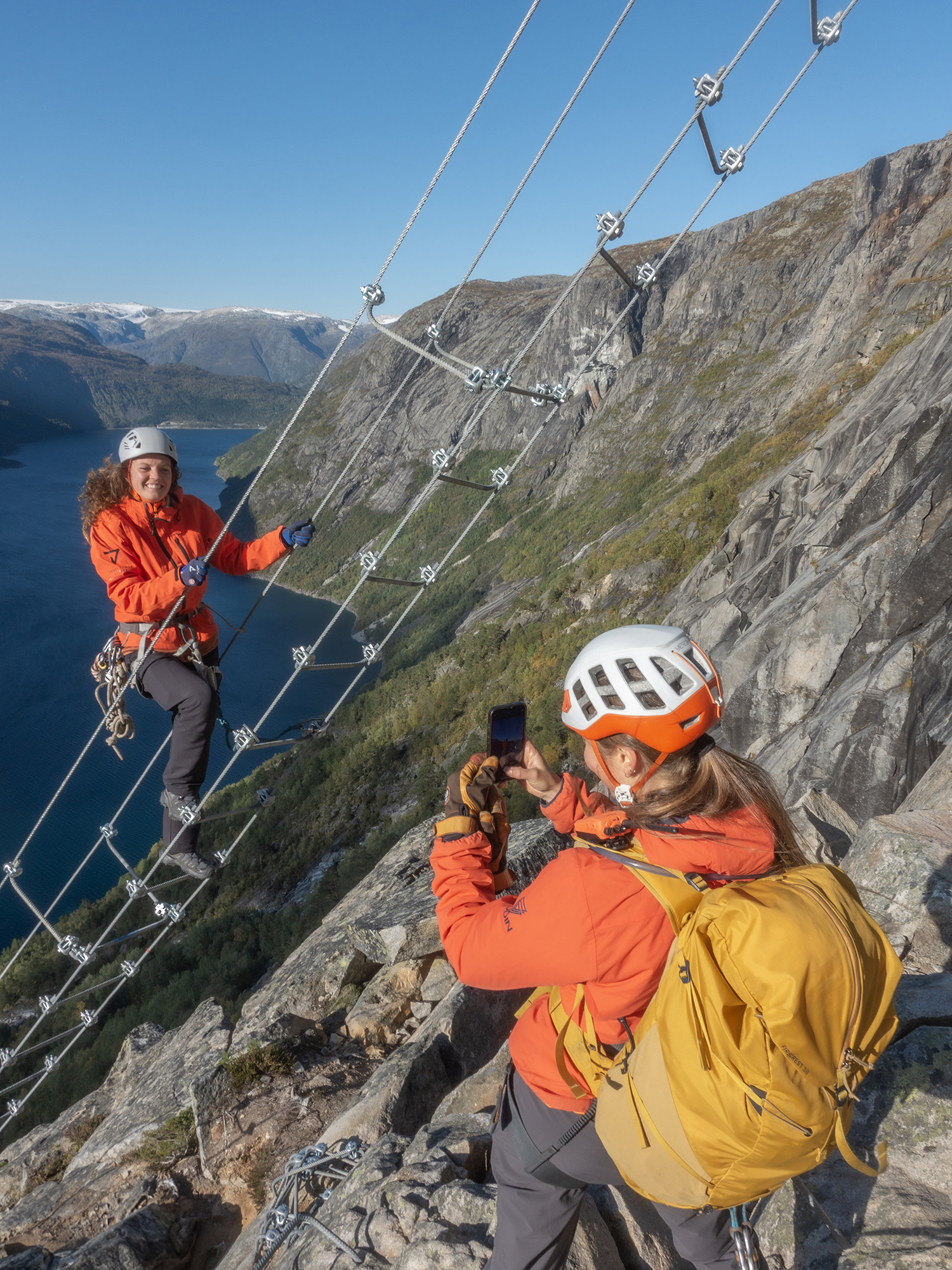 After a short lunch break to refresh ourselves, we’ll dive into the safety instructions. Rest assured, your guide will ensure everyone is ready before we embark on our climb. The Via Ferrata spans three walls, with the highest reaching an impressive 250 m. Equipped with solid steel steps from start to finish, this route is not technical if you manage the normal Trolltunga trail, you should manage the via ferrata, the resemble climbing a ladder (level C). You’ll be securely harnessed with a safety wire throughout the ascent.
