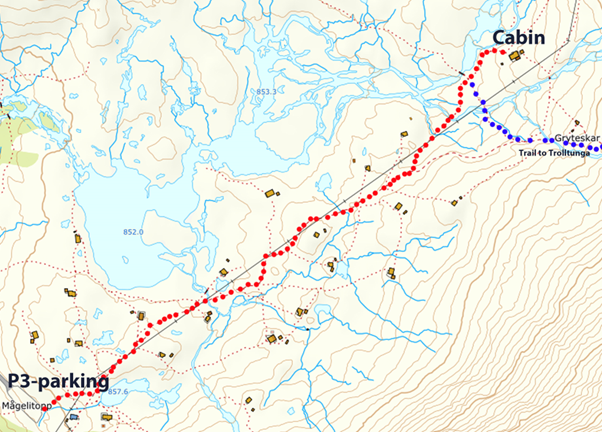 To access the cabin you have different options. If you are driving/private car, you can book a parking at the Mågeltopp/P3 parking. This parking costs 600 nok per day.