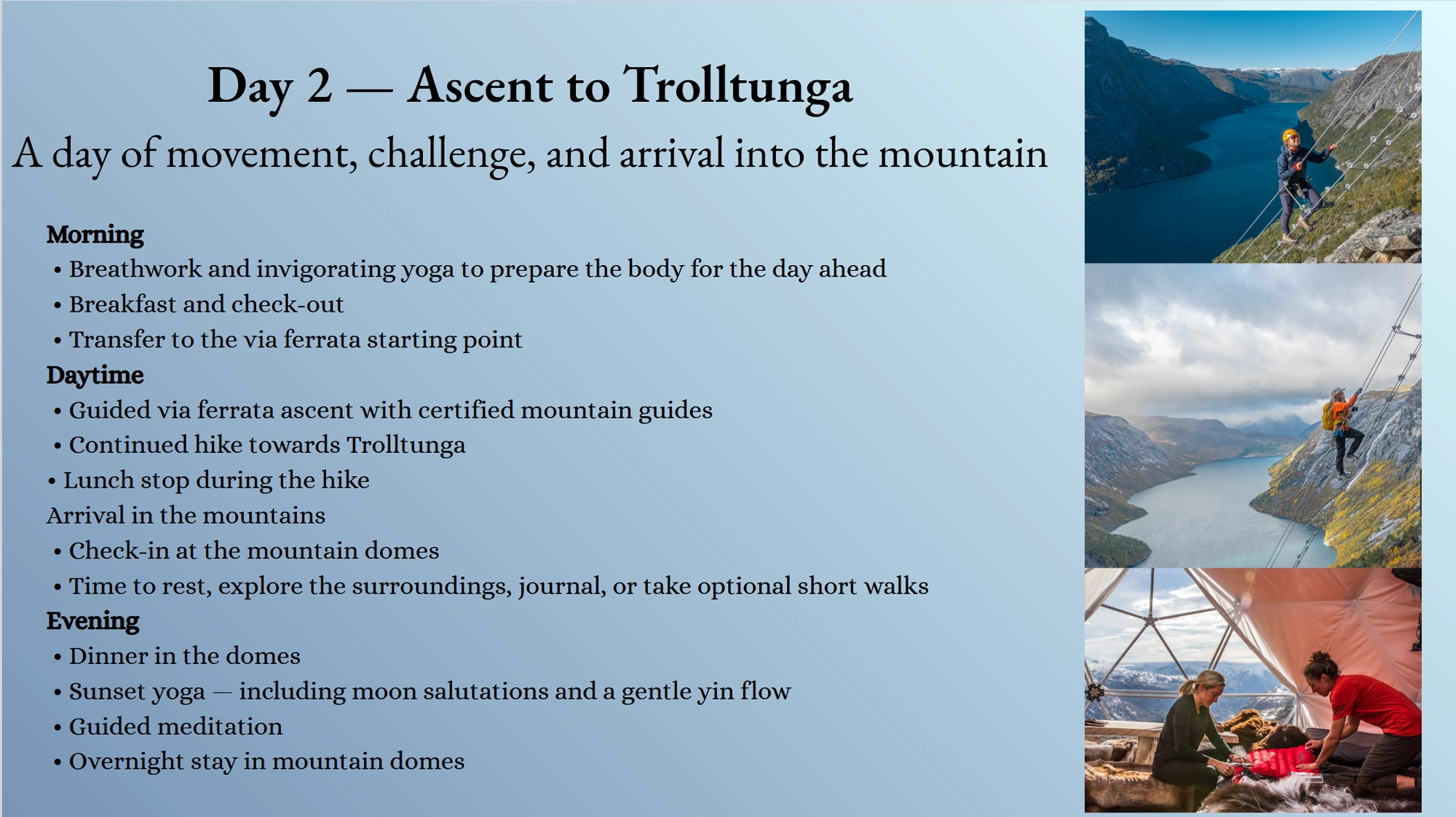 Over four days, you are guided through one of the world’s most powerful landscapes, combining yoga, breathwork, and hiking with the iconic ascent to Trolltunga. From the intensity of the via ferrata to moments of complete stillness above the fjord, the experience moves between challenge and deep presence. We invite you to explore both your physical capacity and your inner landscape.